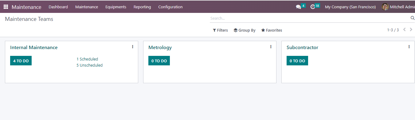 In the Odoo Maintenance module , you can assign a maintenance tewam to maage and monitoor mainatenace orders. When creating a maintenace request, you specify the assigned maintenance team responisble for task. The module’s dashboard provies an overview of different maintenance teams within the company.