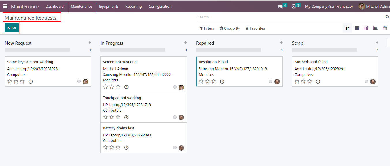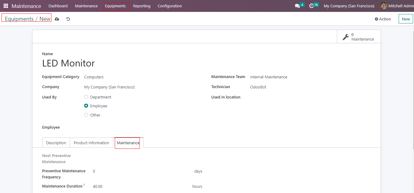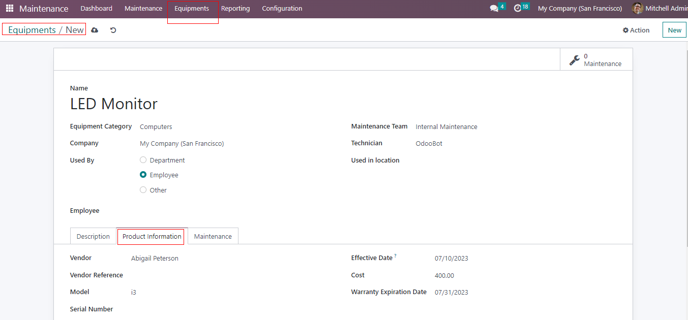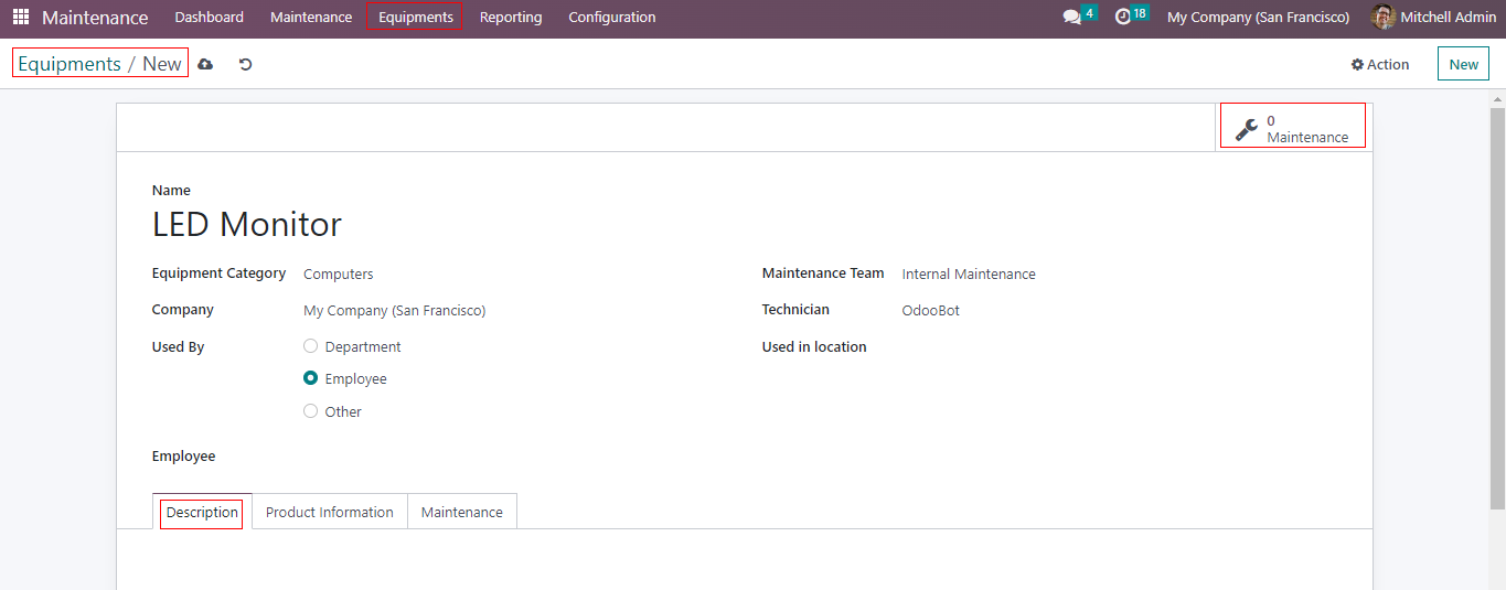 Once , equipment category is configured, you can use the Equipment smart button to view the equipment details assigned to that category. The maintenance smart button displays the list of maintenance requests created for the equipment in that category.