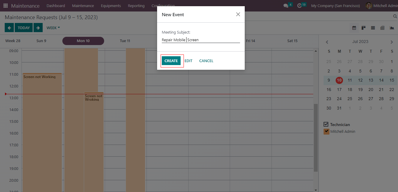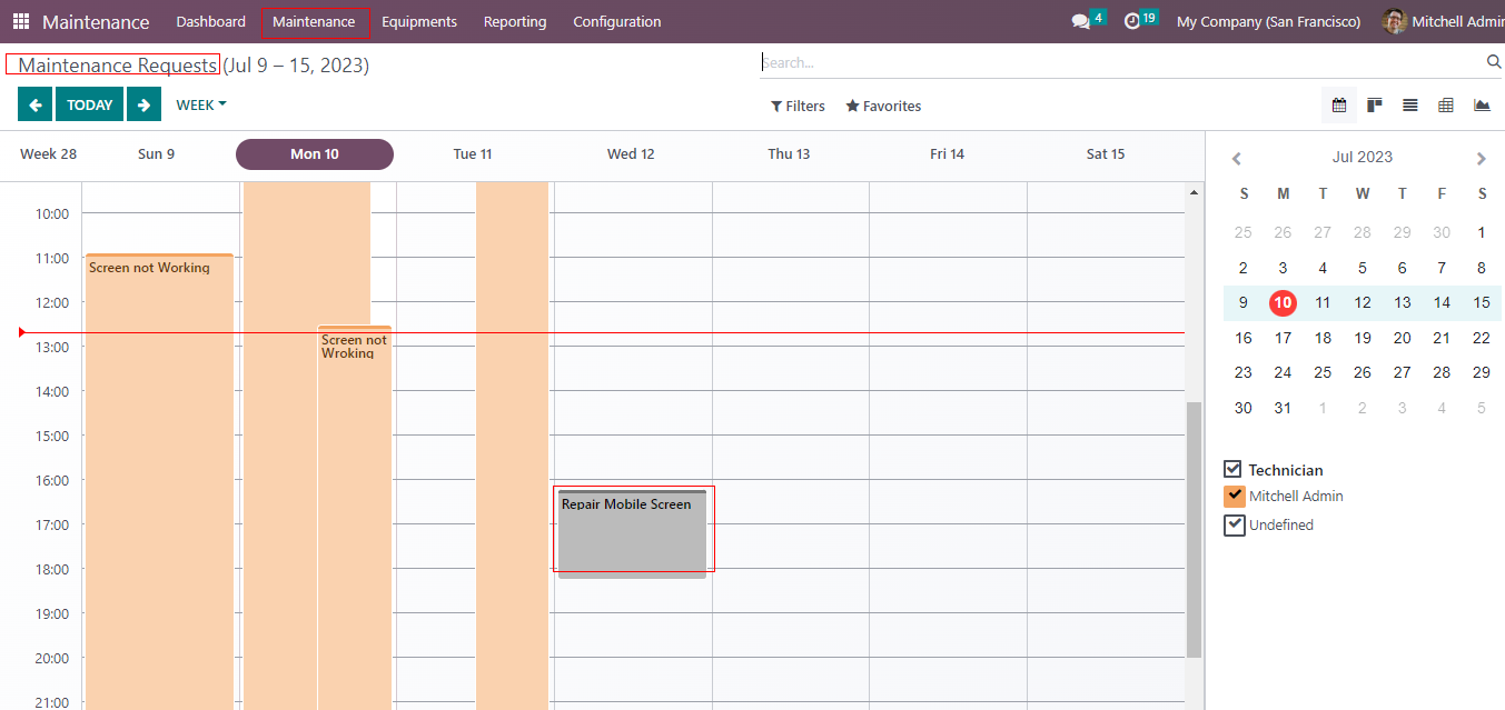 The Maintenance calendar features in Odoo 16’s Maintenance module offers an intuitive interface for scheduling and managing maintenance tasks. Users can view tasks, work orders ,and planned maintenance activities on the calendar. It enables easy resource allocation, efficient scheduling , and reduces conflict in the maintenance schedule. Users can assign tasks to maintenance teams , set deadlines , and monitor progress through the calendar view.