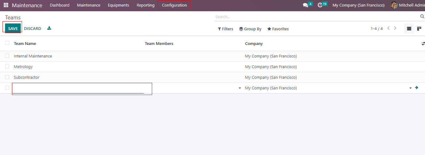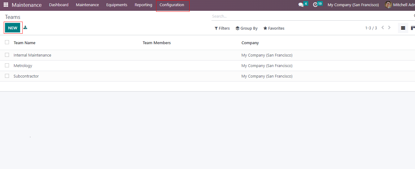 To create a new maintenacne team , access the cconfiguration menu and select Maintenace Teams. Clicking the create button you to add a new team by providing details such as the Team Name, Team Members , an Company. Once saved , the new maintenance team is ready to handle maintenance operatons.