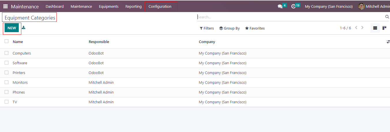 To create equipment categories in the Odoo Maintenance module , access the Equipment Categories option in the Configuration menu. This window displays the existing categories.