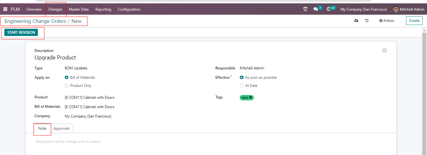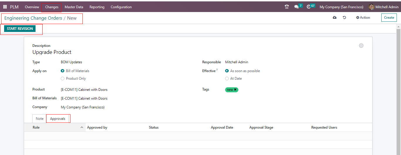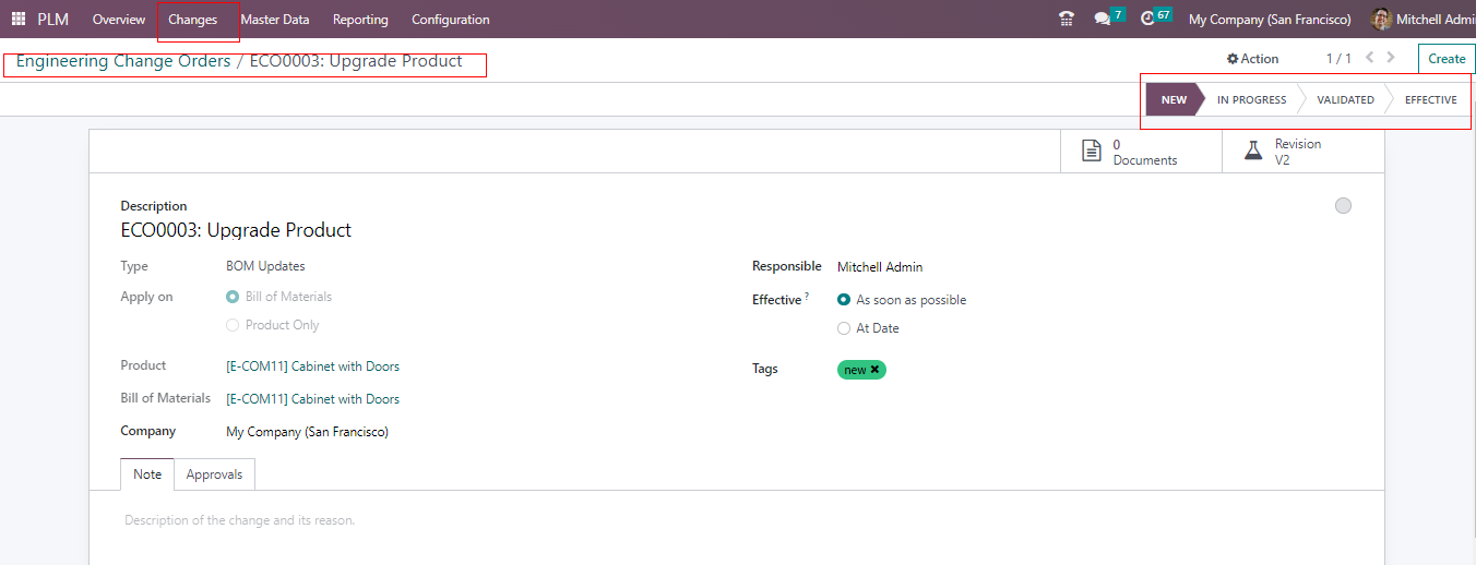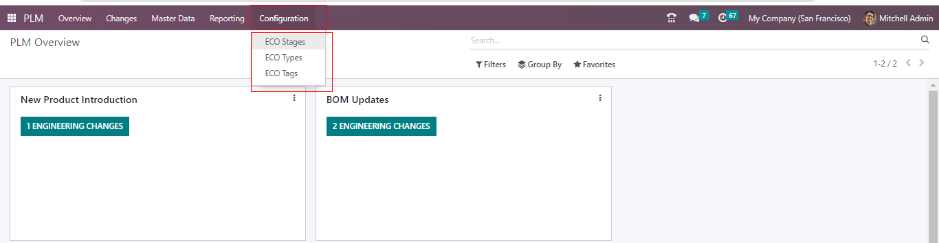 Within Odoo’s PLM module , Engineering Changes Order ( ECOs ) are structured processes designed to manage and monitor modifications to product designs, materials , documentation , and related processes. These ECOs empower businesses to propose , evaluate , endorse , and execute changes efficiently. The module maintains the integrity of documentation , encourages team collaboration , and facilitates industry standards and regulations throughout the product’s lifecycle. It serves as a central hub where innovative ideas are transformed into actionable enhancements.