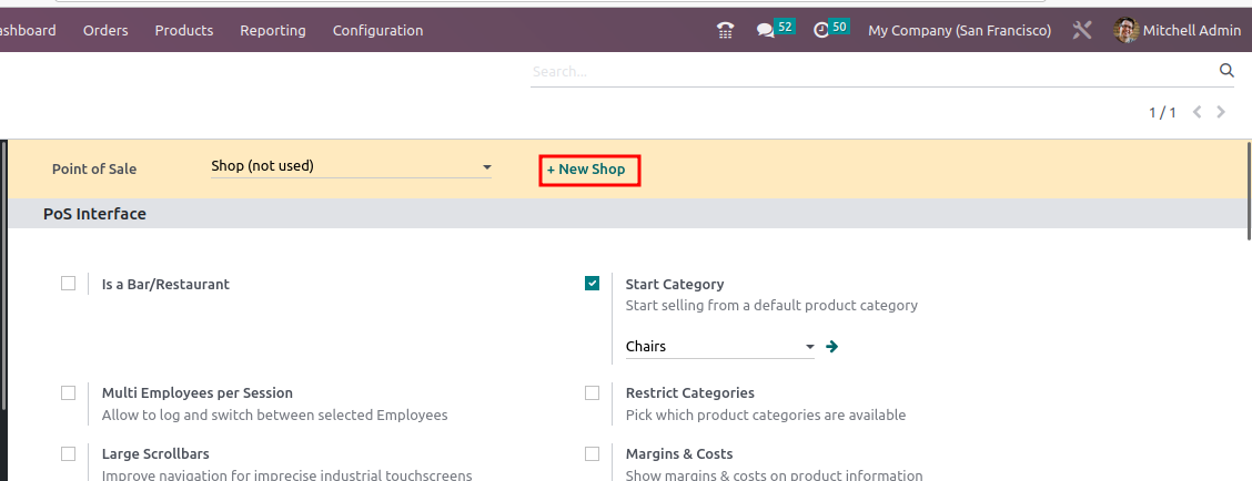 New Point of Sale sessions can be created as required by the company .Click on dashboard configuration, go to the setting and click on the + new shop .
