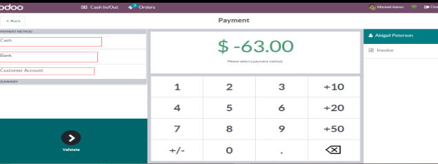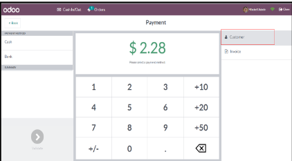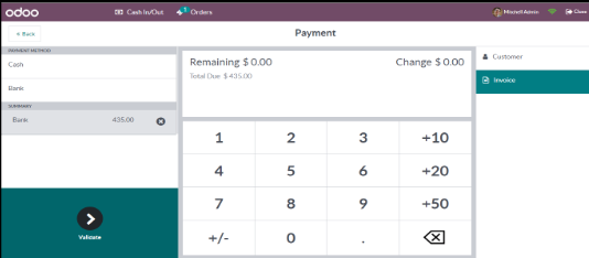 By selecting the payment button, you will be redirected to the payment screen. You can choose the payment method such as cash, bank or customer account. Enter the amount paid by the customer using the keypad. Select the Invoice button to generate the invoice. To validate the payment, select the Validate button.