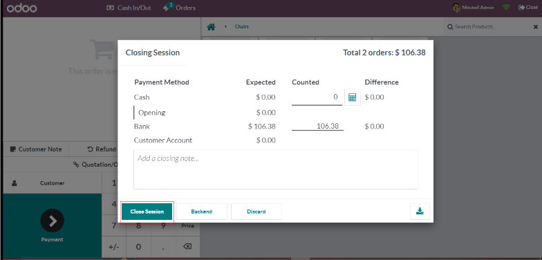 Closing a session in Odoo 16’s Point of Sale (POS) module involves the finalization and reconciliation of transactions made during the session. Once all pending orders are processed or canceled, the cash and other payment methods are counted and verified against the recorded amounts. Odoo compares the entered counts with the expected values and performs a reconciliation process. After confirming the counts and amounts, the session is closed, and the system generates comprehensive reports summarizing the session’s activities and finances. Closing a session ensures accurate record-keeping, facilitates cash management, and provides valuable insights for analysis and auditing purposes.