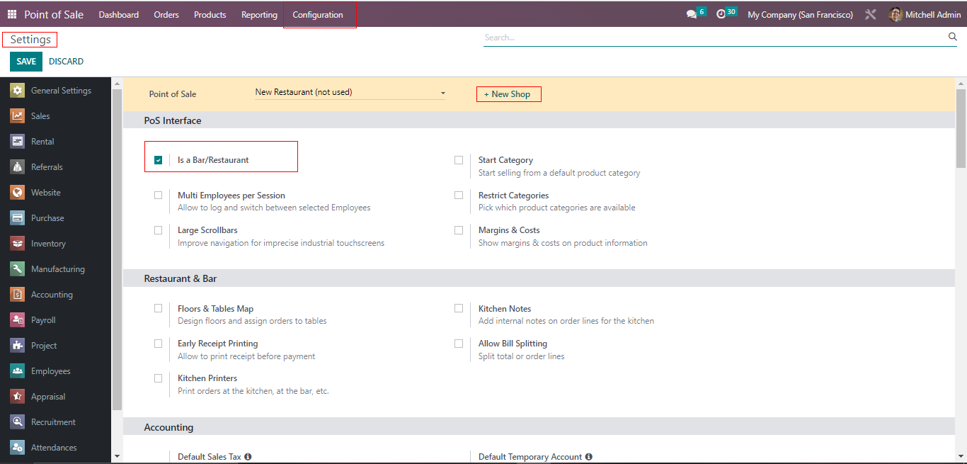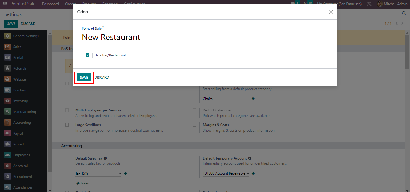 Go to the settings in the POS module and turn on the Is a Bar / Restaurant option. This is the first step t0 configure your restaurant in Odoo 16 POS.