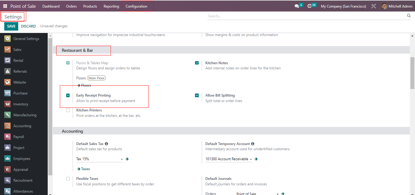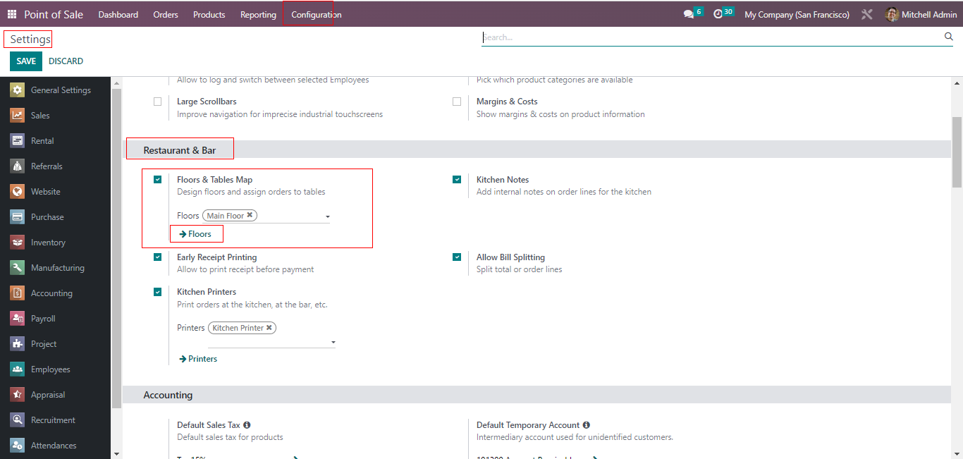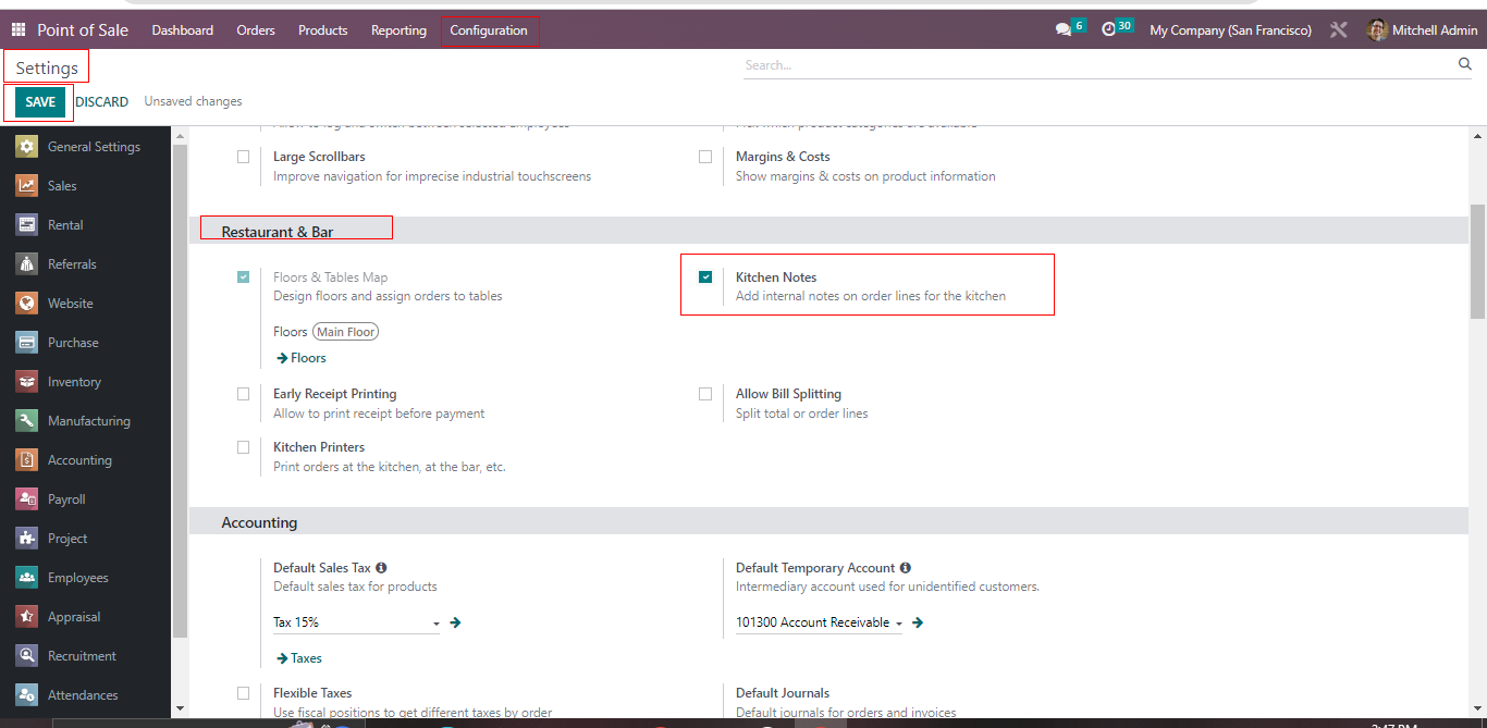Another handy feature for restaurant management is called “Kitchen Notes.” It lets waiters add special messages or notes to the orders they take. You can turn on this Kitchen Notes feature by going into the settings of the PoS module, just like you see below.