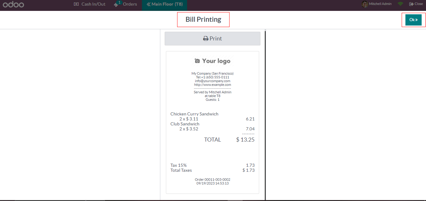 Upon clicking the Bill button, the option for bill printing becomes available , as shown below.