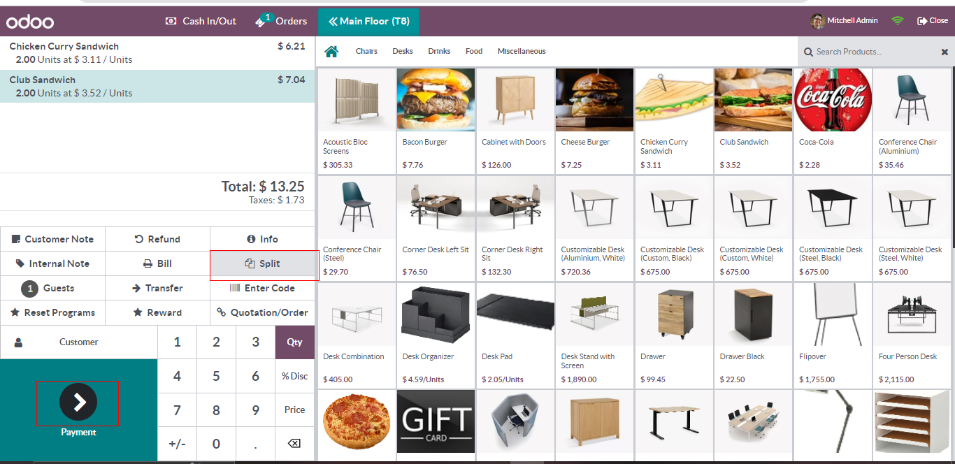 Clicking on the Split button navigates you to a page where you can perform bill splitting by simply clicking on the product, which then divides it accordingly , as shown below.