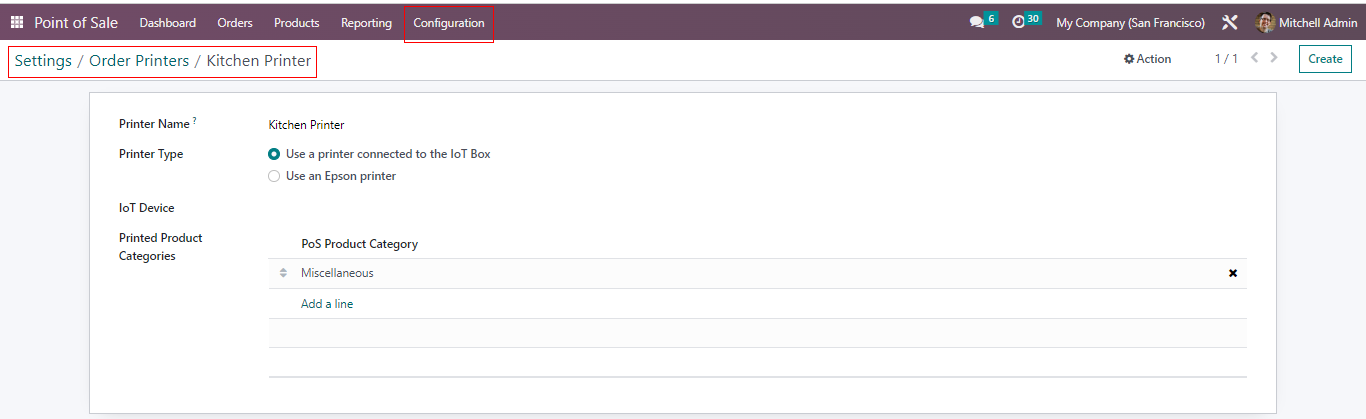 When selecting the Order PRinter option. It grants the user access to configure specific printer details , including the Printer Name , PRinter Type , IOT Device , and Epson Printer IP Address , as displayed below.
