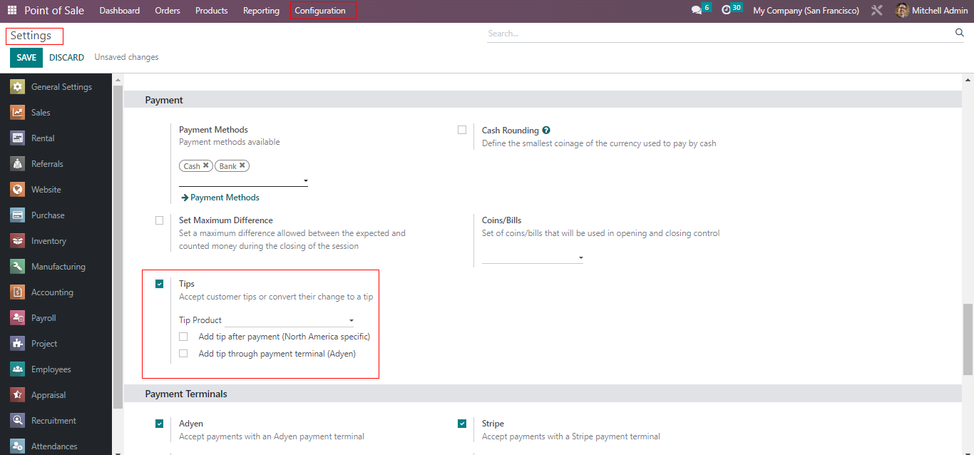 Allow customers to leave tips or convert their change into a tip by turning on Tip Management. Activate the Tips function in Point of Sale Configuration Settings, and customers can select and confirm their tip amount during payment.