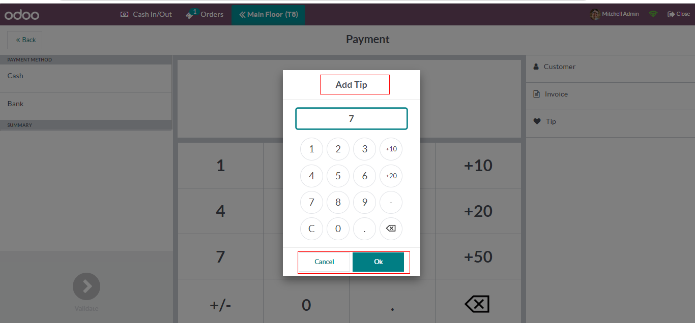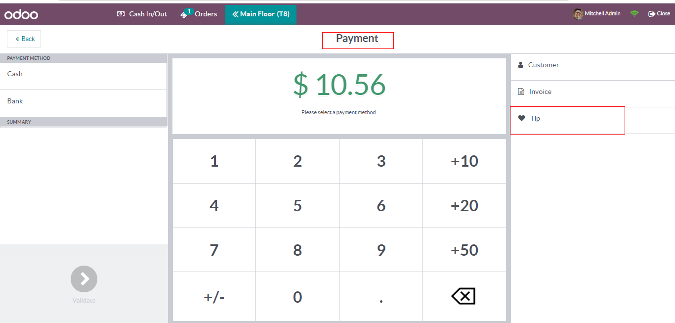 When you click the Tip button , the Tip payment option becomes available , as shown below.