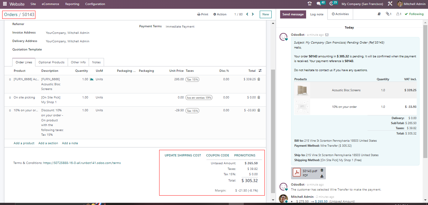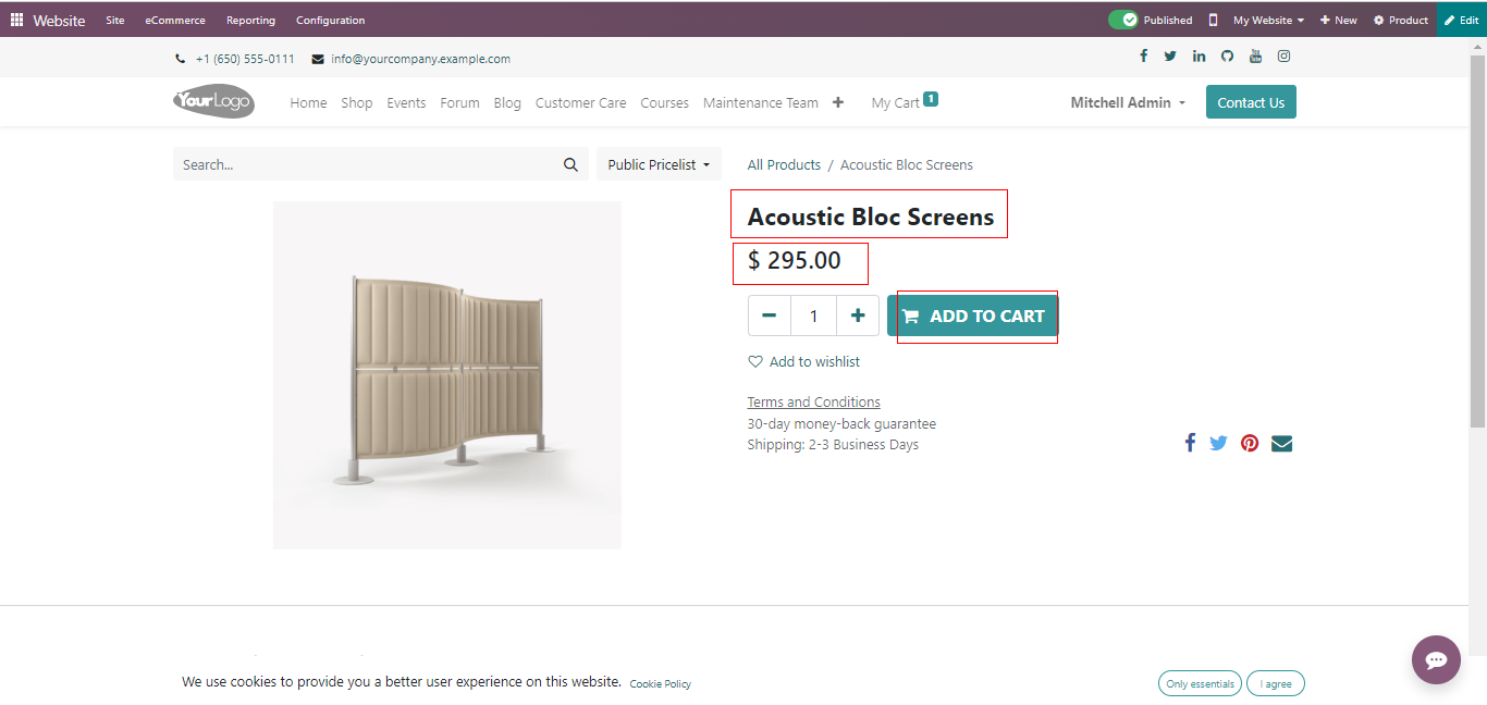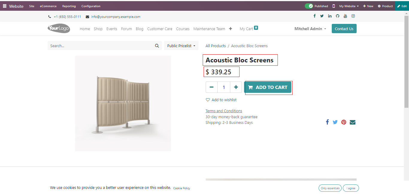 In this section , you will notice that the Acoustic Bloc Screens has been added to the cart with a quantity of one. As a result , the subtotal sales price reflects the cost of a single unit, which is $ 295. Additionally , a 15% tax is applied , equating to $ 15. When you add this tax amount to the initial sales price , the total amount comes to $339.