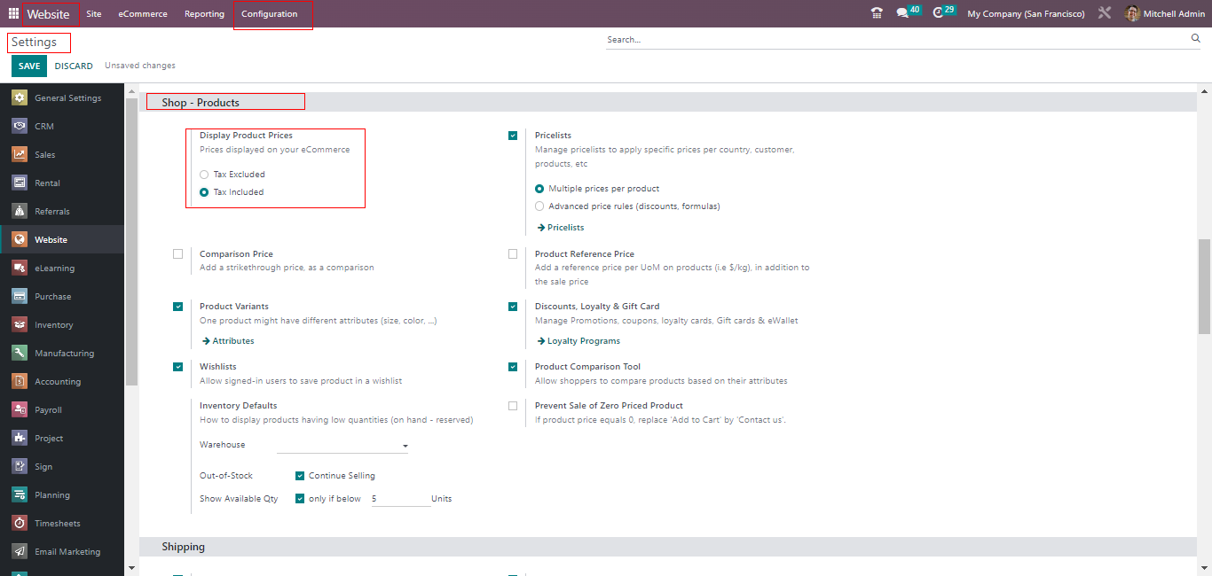 - In the Configuration tab of the Website module , choose Settings and set Display Product Prices to Tax Included.