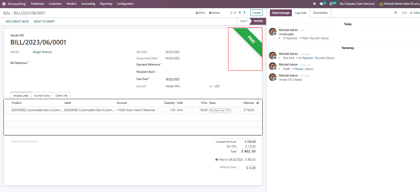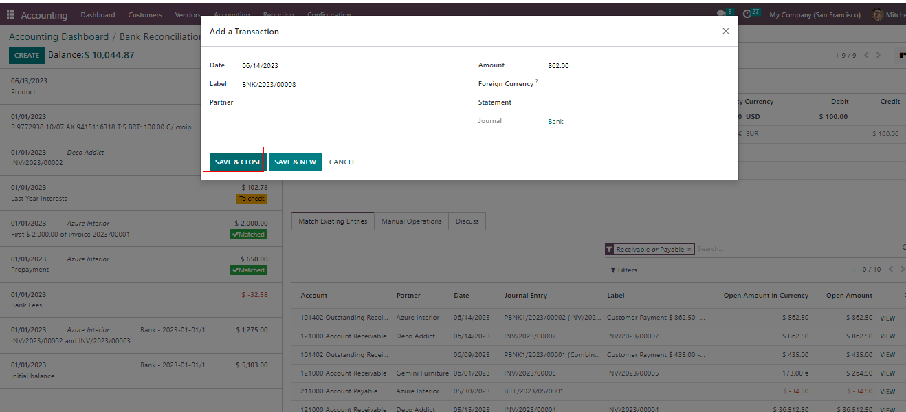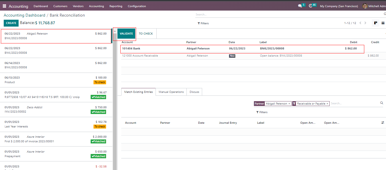 Click on the Validate button to match the bank statement . By reconciling bank statements with vendor bills and payments, you can ensure accurate tracking of expenses and manage cash flow effectively. The system automatically matches transactions, suggests reconciliations, and keeps a record of outstanding payments, simplifying the bank reconciliation process and providing comprehensive financial insights.