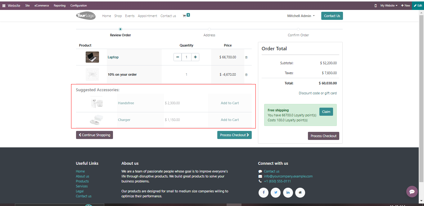 After adding products to the cart, customers can review their orders during the checkout process. Here you can see a suggestion of accessory products that you configured in the upsell and cross- sell sections of the product form. Customers can get more value out of their purchases by purchasing the right accessories. And you can increase your chances of making a sale by encouraging customers to add additional products to their cart.