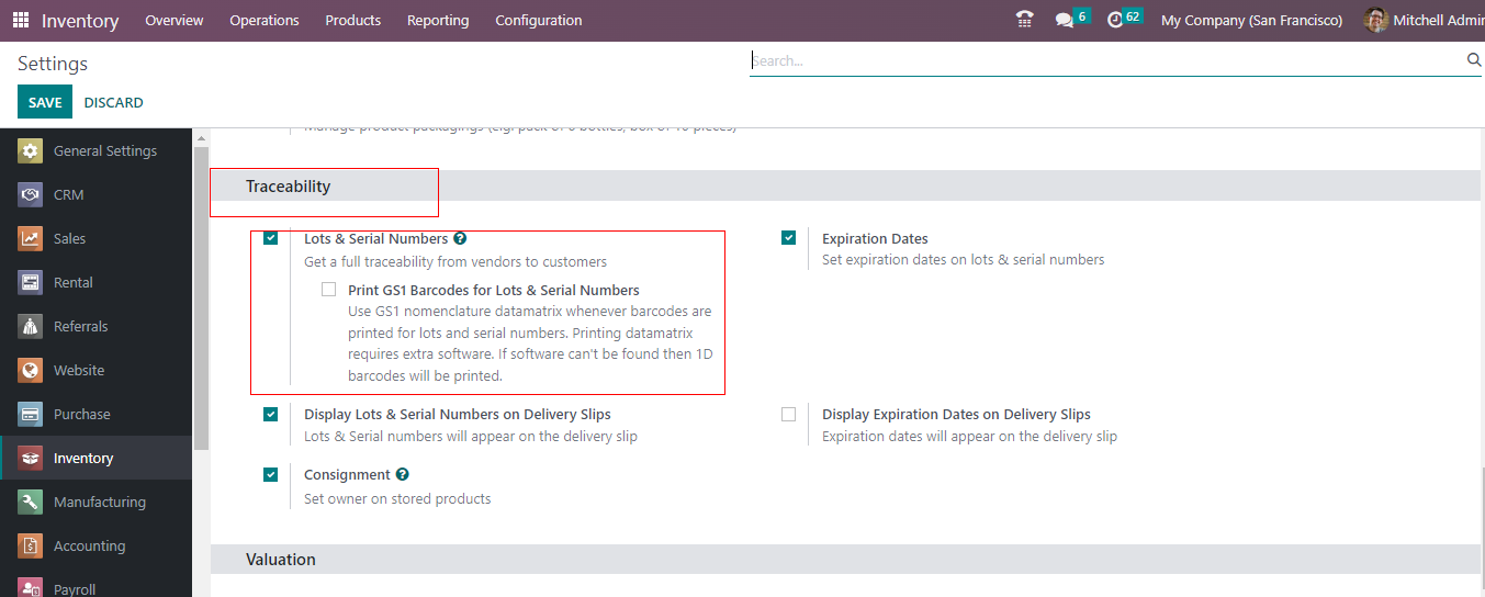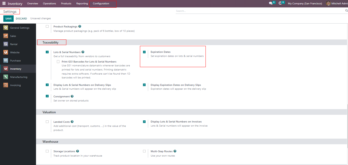 In the configuration settings of the inventory module, you have the option to enable traceability features for setting up lot and serial numbers, as illustrated in the image below.