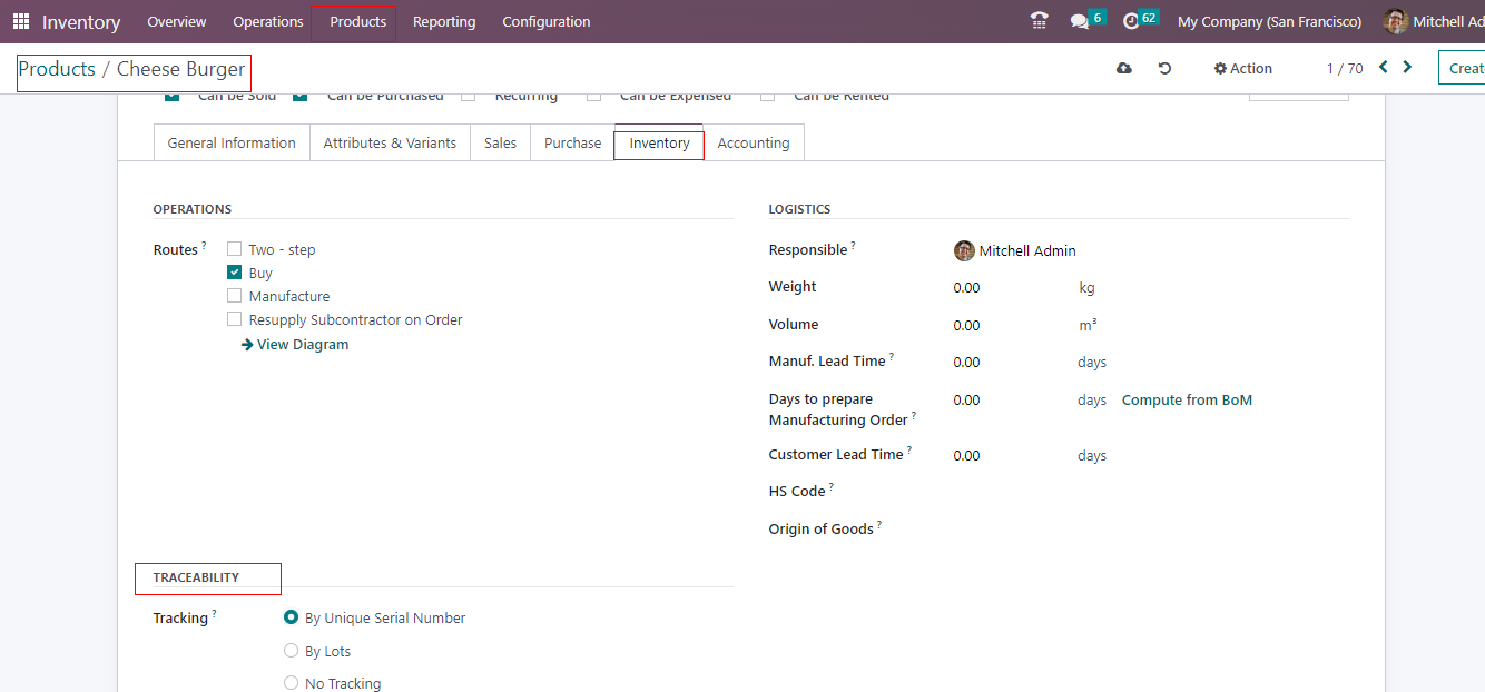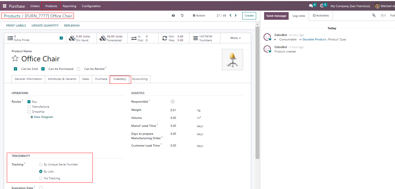 Enabling these features grants you access to a product’s traceability within the inventory tab of the product form.