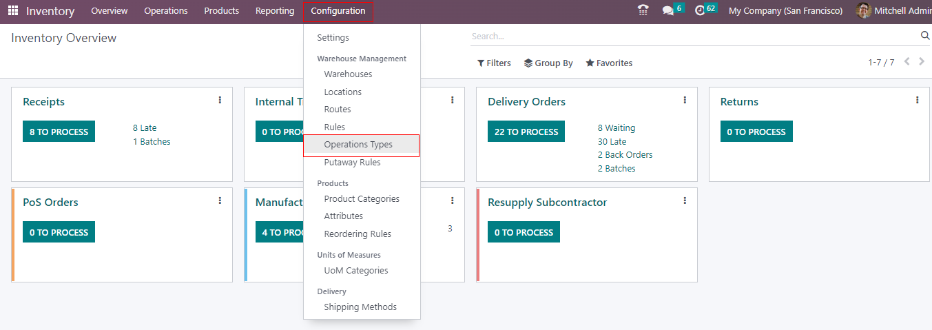 In Odoo 16, operation types play a crucial role in categorizing various inventory operations. These operations encompass functions such as receipt, delivery, manufacturing, and internal transfer. Each type serves a specific purpose in managing and tracking inventory throughout the supply chain.