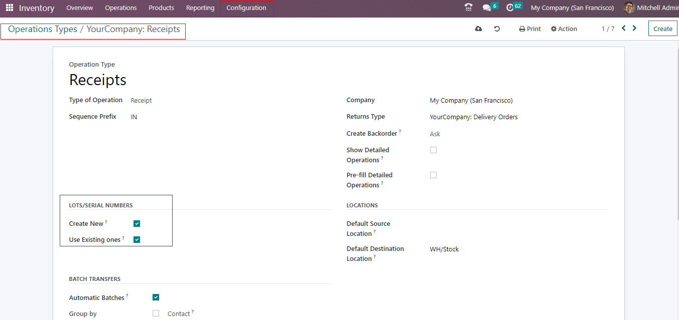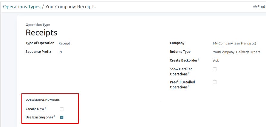 Regarding the operation types, if you wish to utilize existing lot/serial numbers and prevent the creation of new ones, ensure that the “Use existing one” field is enabled in the operation type settings. This option restricts the system to only allow the use of already existing lot/serial numbers, providing better control and consistency in product tracking throughout the inventory management process.