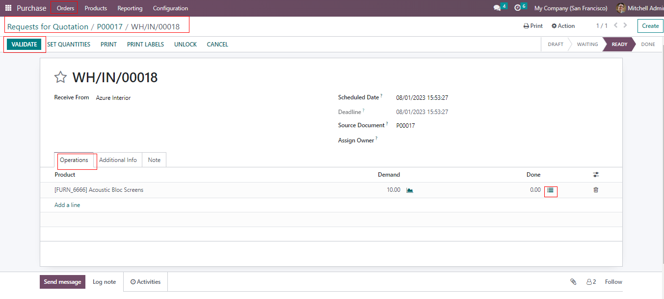 After adding the lot number “LT-01” and updating the done quantity for the 10 quantities of pens received, these items will now be associated with the Lot Number LT-01. To proceed with finalizing the receipt process, remember to click on the “Confirm” button and then validate the receipt. This will ensure that the products are now linked to the specified lot number and properly recorded in the system for effective traceability.