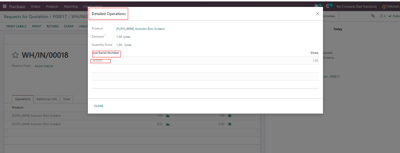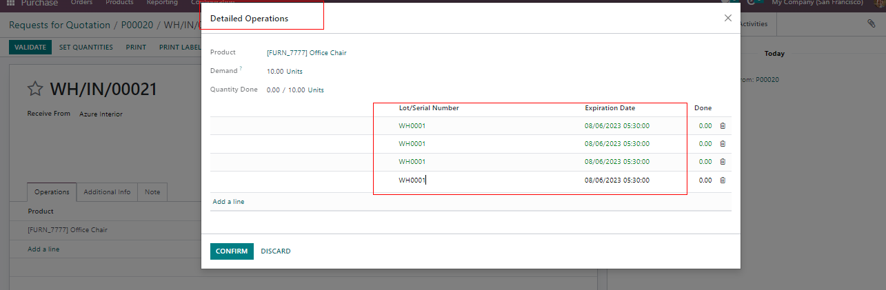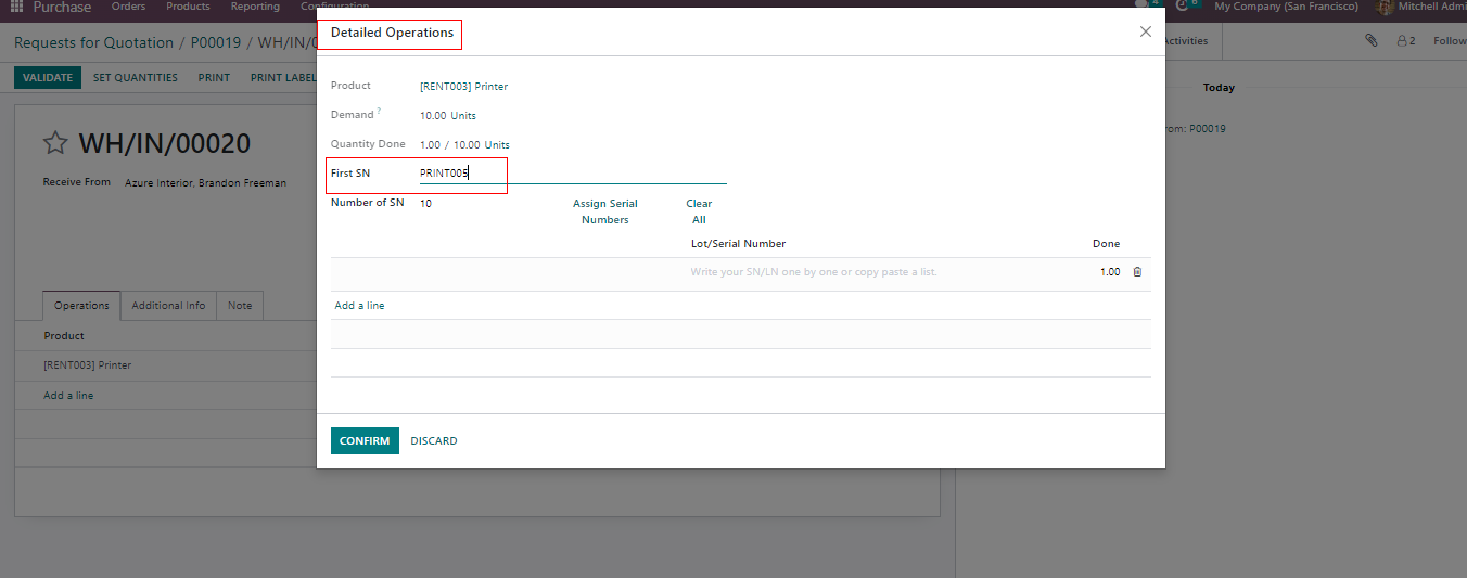 In this pop -up window, you have the option to provide the serial number for the products.When purchasing a large quantity of items , manually assigning a serial number to each one can be a cumbersome task. To simplify this process, Odoo offers an automated solution where you need to specify the first serial number of the product and the number of serial numbers required.