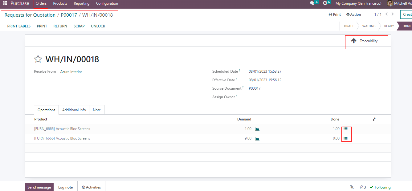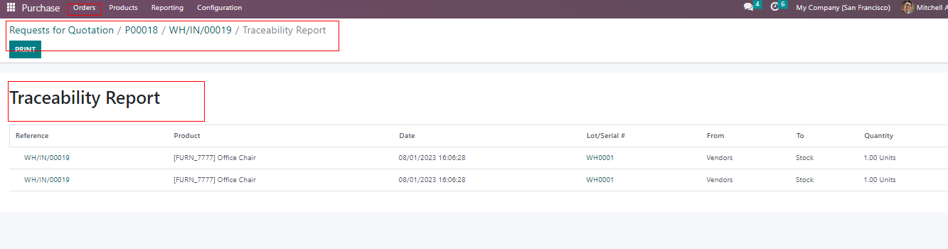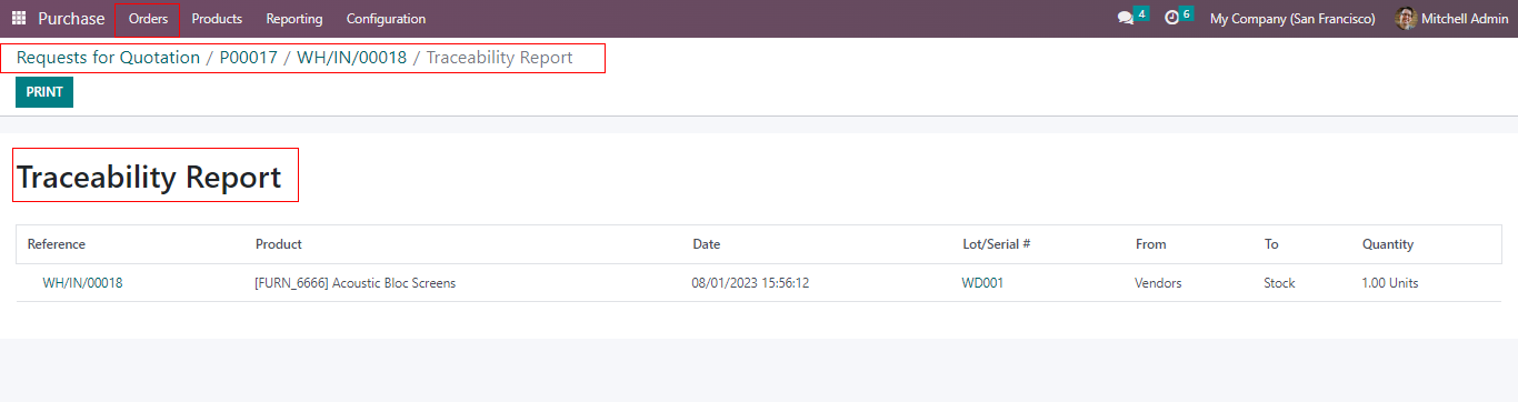After validating the receipt , you can access the traceability report to review the details of the received products and their associated lot/serial numbers.
