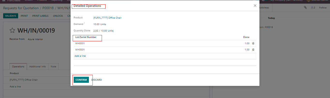 After selecting the product with tracking via a unique serial number in the purchase order as mentioned above, you can proceed to set up the serial number during the product’s receipt once the order is confirmed. This allows you to associate the specific unique serial number with the received product, ensuring effective traceability throughout its lifecycle.
