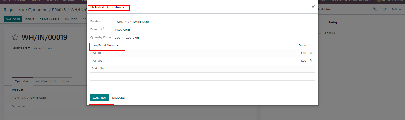 During the product receipt process, you can assign the lot number to the received items, just as we did before. To do this, click on the “Add a line” button and input the desired lot number for the specific product. This action will associate the product with the designated lot number, allowing for easy and accurate tracking of the batch throughout its lifecycle.