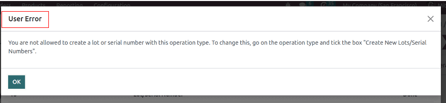 When attempting to create a new lot/serial number, an error message will appear, indicating that you are not permitted to generate a new lot/serial number. This message is displayed because the operation type has been configured to only allow the use of existing lot/serial numbers, thereby enforcing strict control over the tracking and management of products within the specified lot numbers.