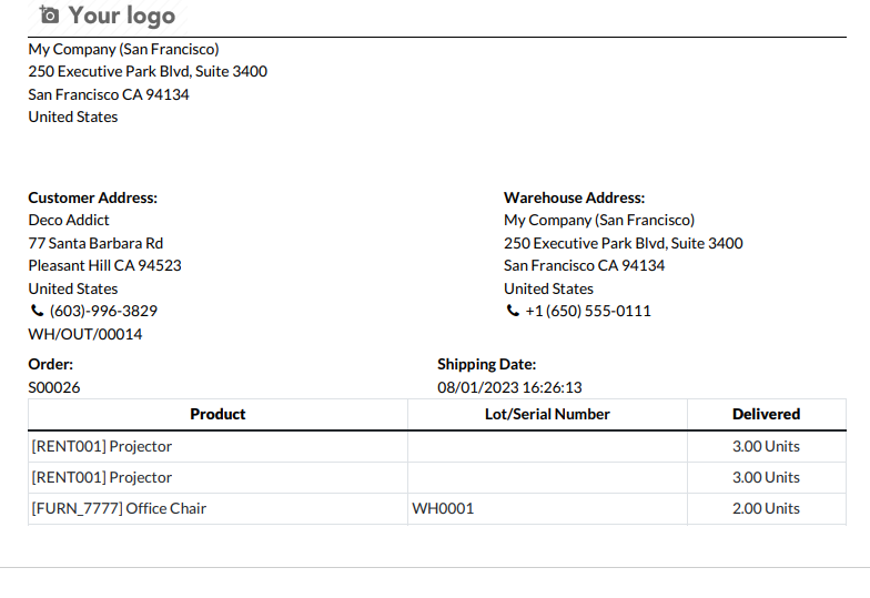 Upon completing the delivery process, you will notice that a print button is generated. By clicking on this button, you can easily generate the delivery slip. The delivery slip contains essential details about the shipped products, including their associated lot/serial numbers, ensuring clear traceability and transparency throughout the supply chain. This enables smooth documentation and communication with customers, providing them with a comprehensive record of the delivered items.