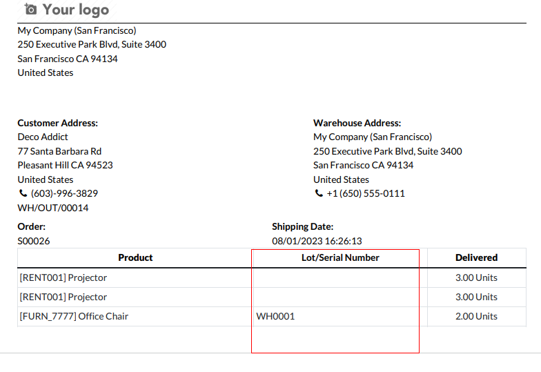 Exactly, you will also find the Lot/Serial number displayed on the invoice. This practice ensures consistency with the information provided on the delivery slip and allows customers to have a comprehensive record of the product’s Lot/Serial number throughout the entire sales transaction. Including this data on the invoice adds clarity and transparency, making it easier for customers to track and verify the authenticity and origin of the purchased product.