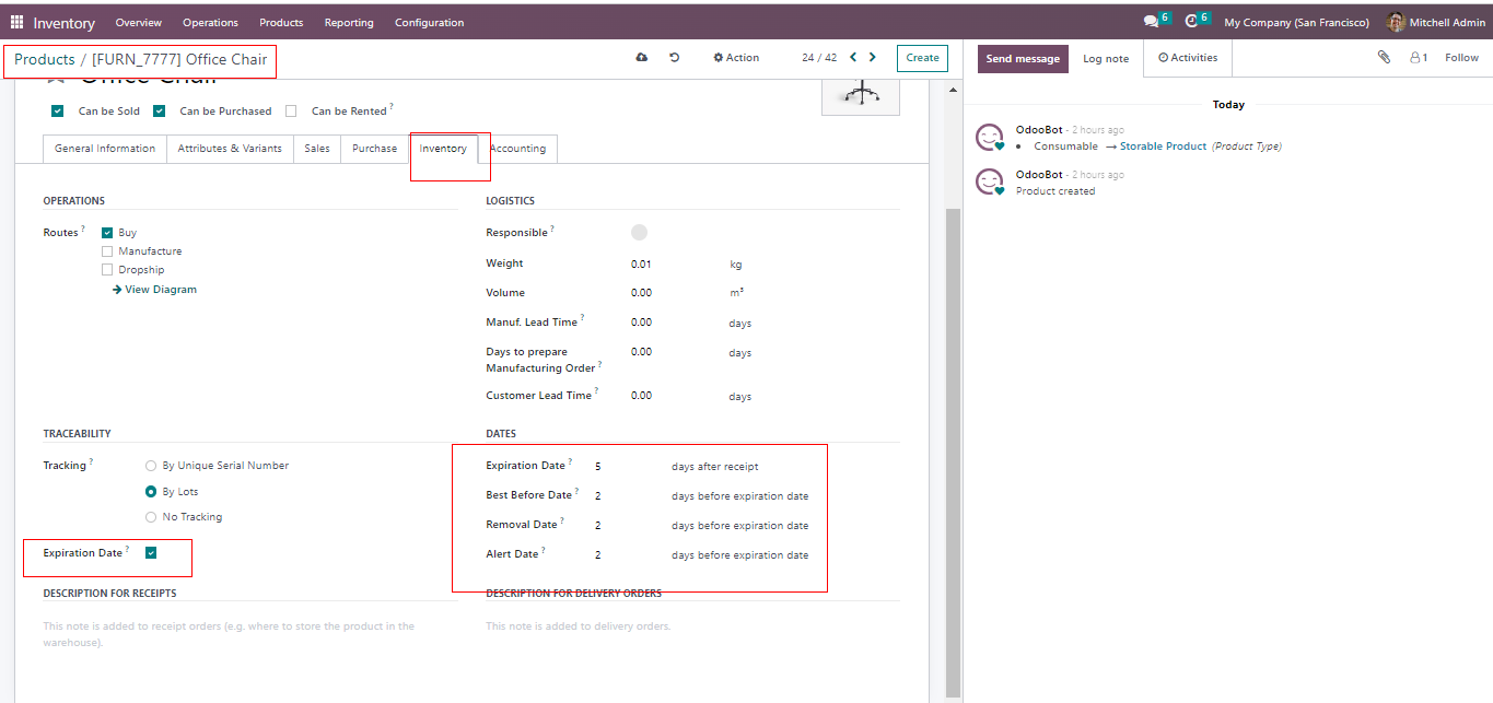Enabling product traceability allows you to incorporate expiration dates for better inventory management. After enabling the feature, you can set up important expiration – related dates such as receipt date , best before date , removal date , and alert date for the product.