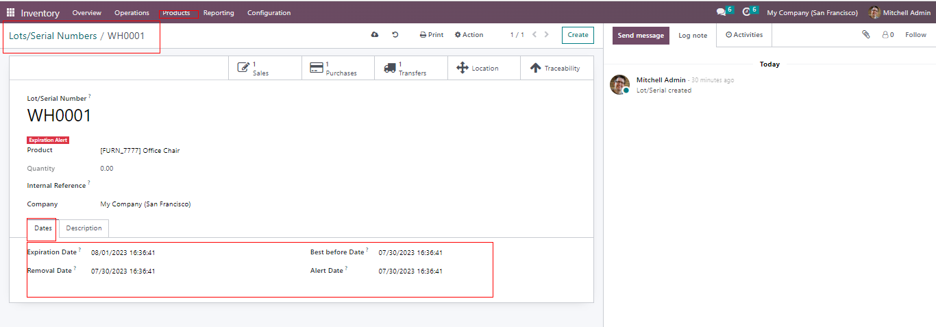 From this section, you can also observe the best before date, removal date, and alert date, all of which are calculated based on the specific number of days configured in the product form. These dates provide valuable information about the product’s freshness, the recommended date for its removal from inventory, and any alerts set to notify you about approaching expiration or removal dates. Having these details readily available enhances your ability to make informed decisions regarding product management, ensuring timely actions to maintain product quality and prevent any issues related to expired items.