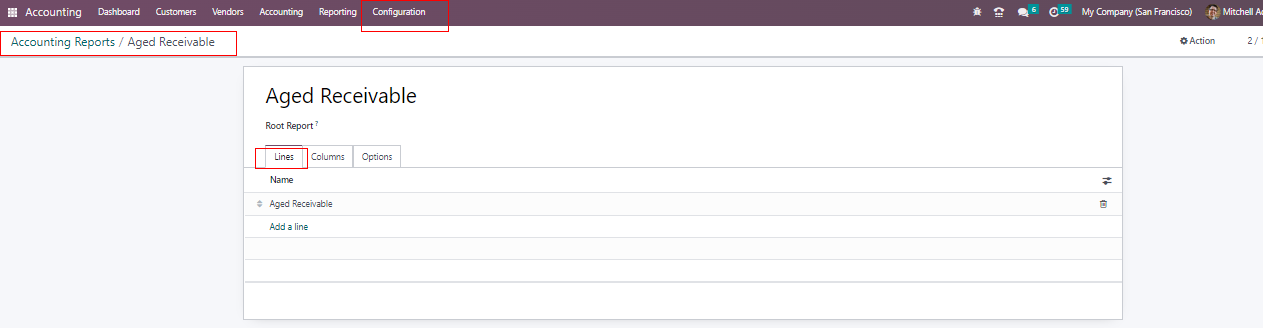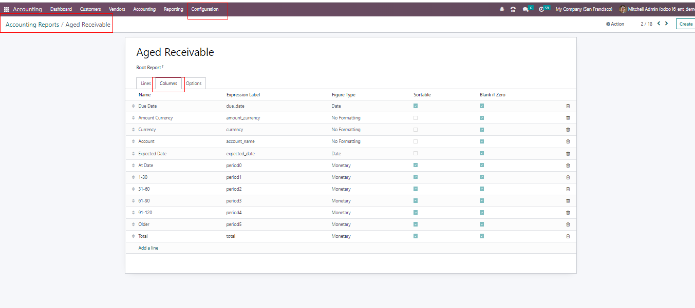 Once you complete the creation of the new line and column, you will see the new reporting line under the “Aged Receivable” report list. Now, let’s explore how to add a new column for a specific report using the “Column” tab shown in the screenshot.