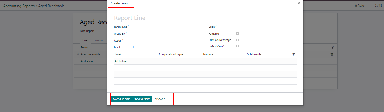 On this page, you will find the name of the report you have selected. To customize the report further, navigate to the “Lines” tab provided on the page. Here, you can utilize the “Add a Line” option to specify new report lines. When you click on the “Add a Line” option, a new window will appear, as depicted in the image below.