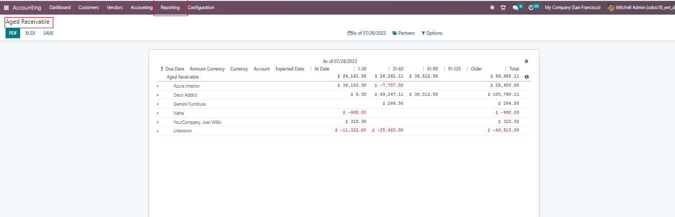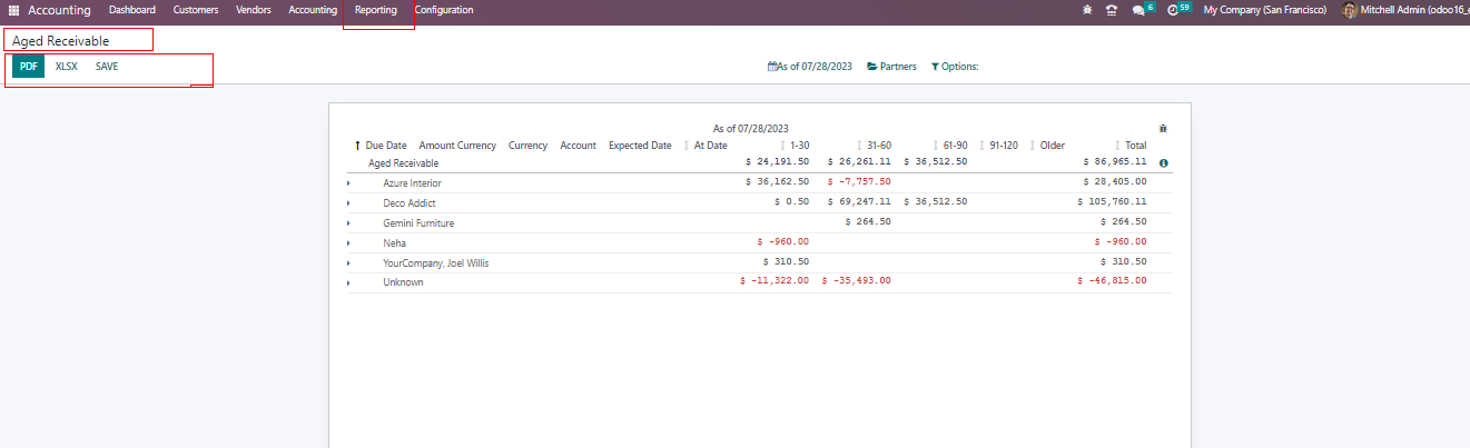 The Aged Receivable option in the reporting menu of the accounting module provides reports of aged partner receivable balances based on the selected date. This report shows outstanding payments from customers who have not paid their invoices within the specified payment terms. It displays details such as the selected date , older outstanding amounts, and the total outstanding balance.