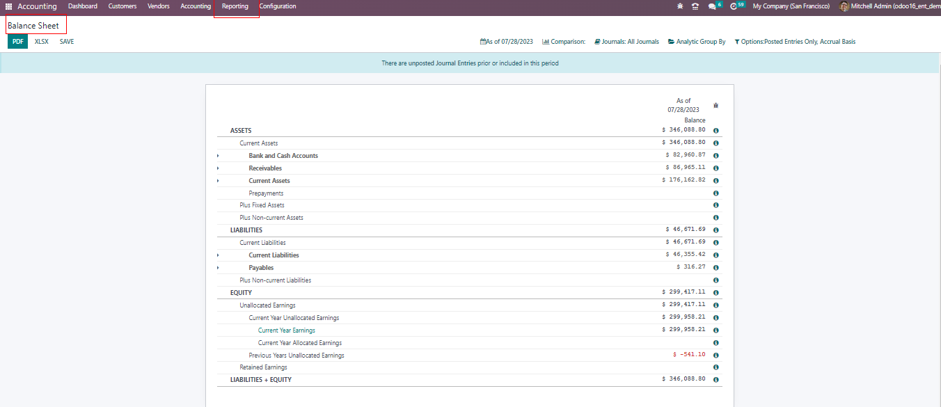 The balance sheet report provides crucial information about an organization’s assets, liabilities, and equity at a specific point in time. Creating balance sheets is a breeze using the accounting module and selecting the reporting option. By choosing a particular date using the small calendar icon, the balance sheet will be generated for that specific date. The page displaying the balance sheet will appear as shown in the screenshot below. This report enables businesses to assess their financial position accurately and make informed decisions based on their assets and liabilities.