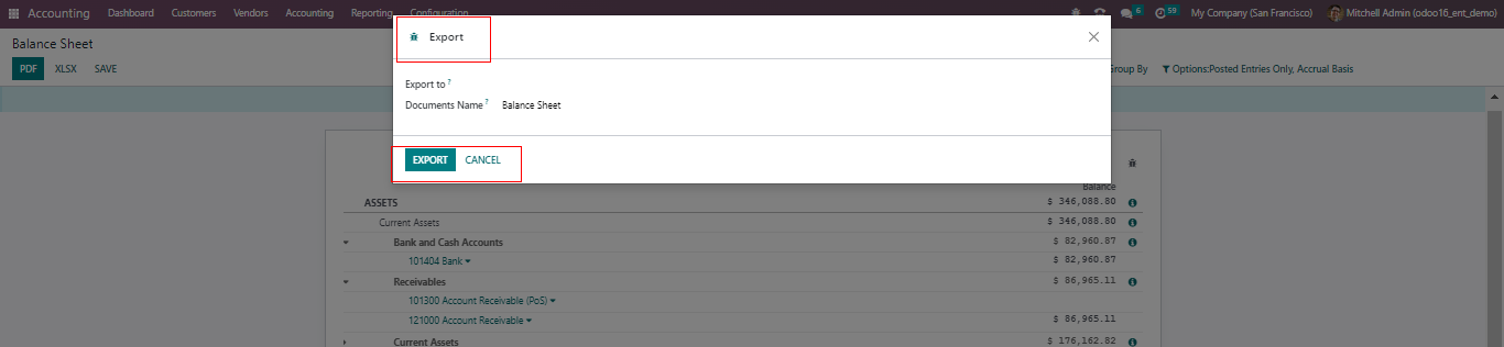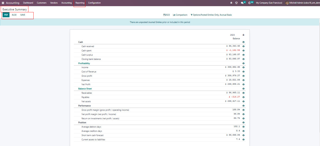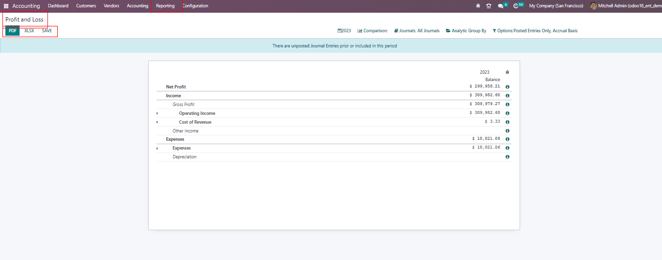 Using the comparison tool, you can compare the report with the previous one. The journal can be selected from the provided journal adoption. On triggering the developer mode, you will get a small icon that shows the calculation formula of the particular reporting line. With the help of the PDF and XLSX options, the data can be converted into the required formula. You can make use of the SAVE icon in order to export the PDF and XLSX of the document. On selecting the save icon, you will get a page, as shown in the image below.