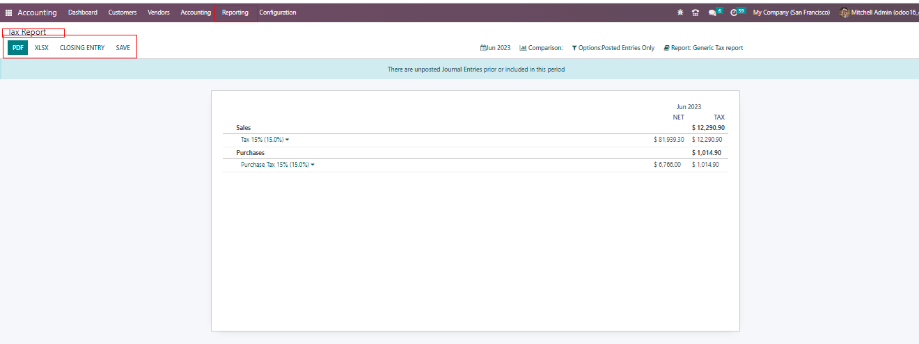 In the screenshot above, you can observe the Tax Report page, accessible from the reporting menu.This page offers detailed reports on sales and purchase taxes. Using the Closing Entry, you can select a specific tax period and generate the relevant tax return for that particular period.