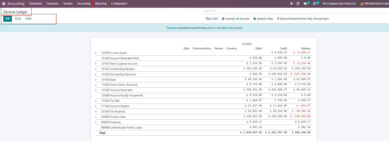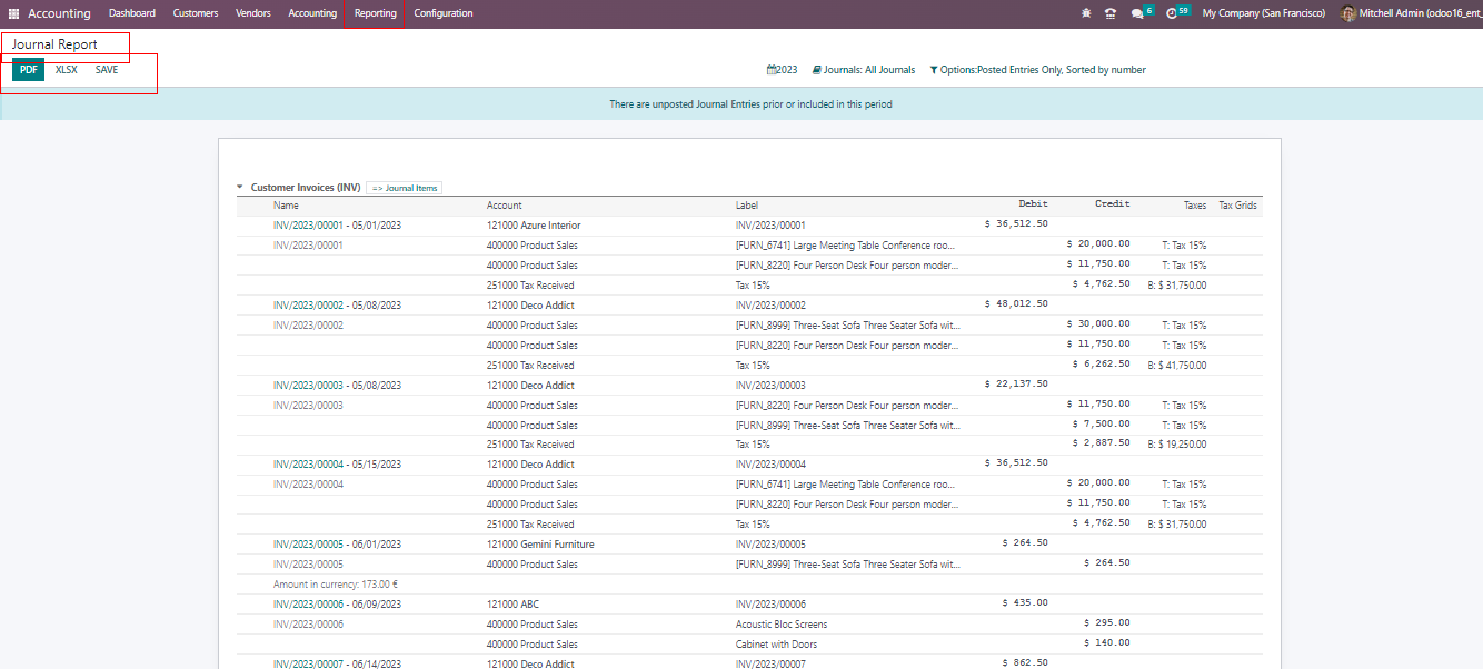 The next option in the accounting module’s reporting menu is the “Journal Report.” This report provides a comprehensive overview of a specific journal, containing information such as the journal’s name, associated accounts, labels, and debit and credit details. The page of the journal report displays all the mentioned details, as shown in the image below. This report is valuable for analyzing and tracking journal entries, aiding in efficient financial record-keeping and analysis.