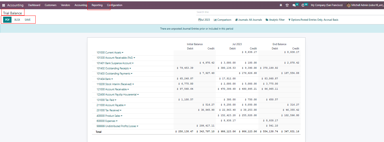 Additionally, like other reports, you have the option to export the Trial Balance in PDF, XLSX formats, and the option to save it. The Trial Balance serves as a crucial tool for ensuring accurate accounting and is instrumental in the auditing process.