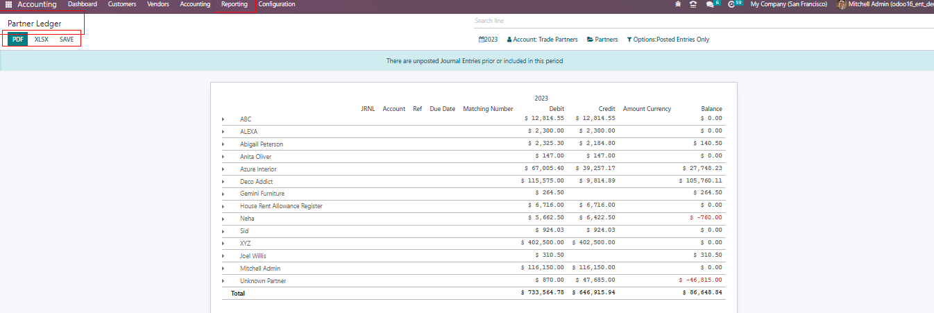 As shown in the screenshot below, the partner ledger page presents all the mentioned details, providing a clear and organized overview of transactions with each partner. This report simplifies the process of monitoring and managing financial interactions with partners, facilitating efficient record-keeping and reconciliation.