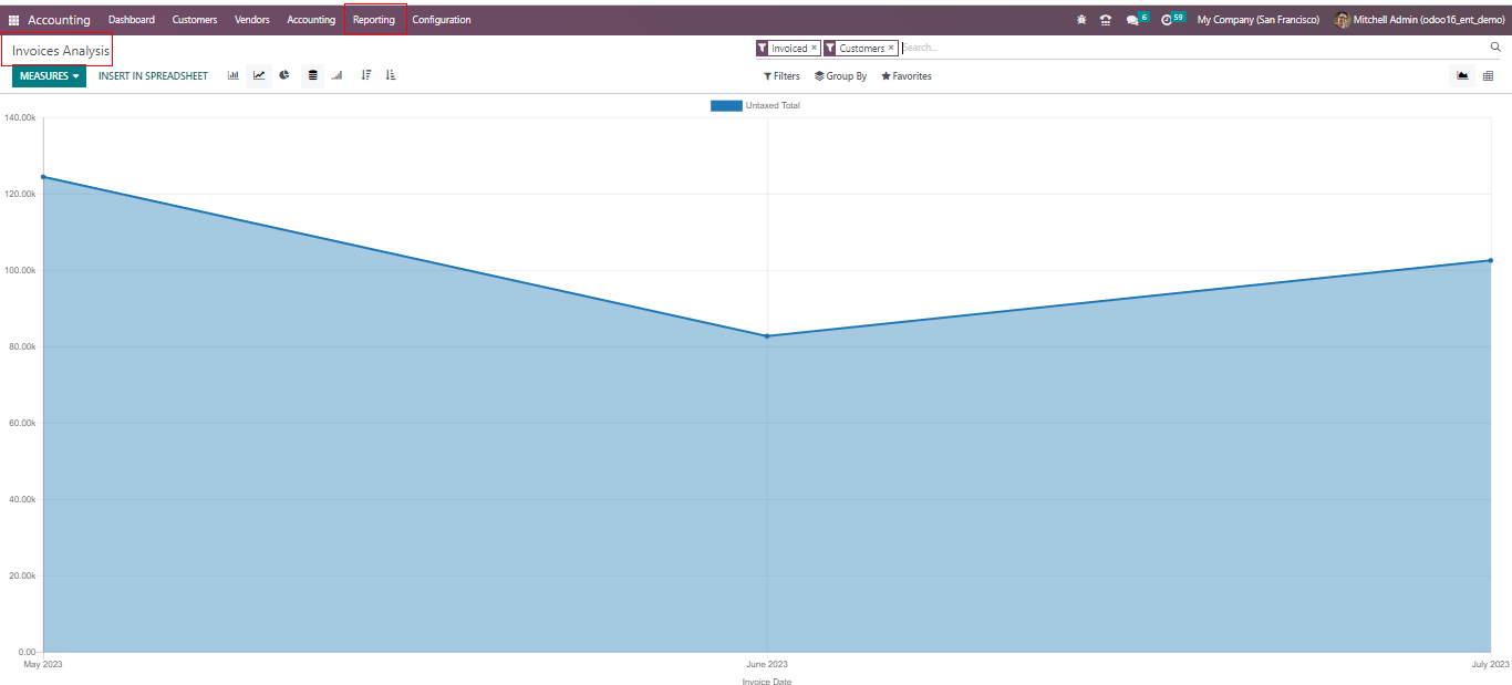 The Invoice Analysis option in the reporting menu allows for the analysis of invoice reports within a selected period.This report can be viewed in graphical and pivot views, providing valuable insights into the company’s invoicing activities.