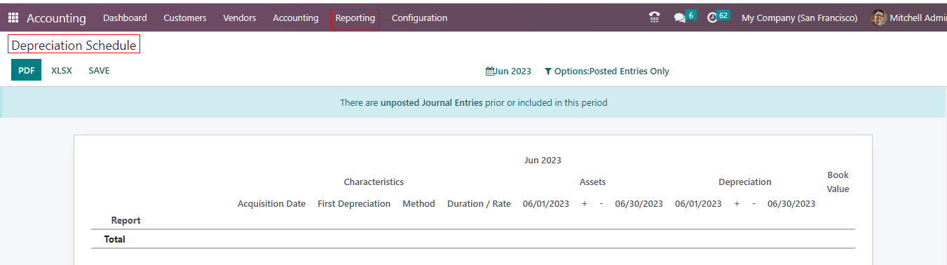 The “Depreciation Schedule” option in the accounting module’s reporting menu displays schedules for the depreciation cost of valuable assets over specific accounting periods. The page provides details like acquisition date, first depreciation, method, duration or rate, depreciation date, and book value. This report assists in managing asset depreciation effectively. Additionally, the accounting reports offer various options tailored to your specific needs.