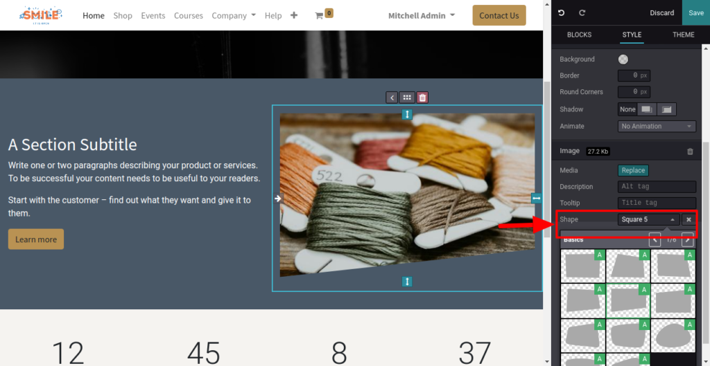 It is online and can be used. But you can also edit as per your choices. Like for example you can make photos dynamic. The new version comes with dynamic shapes. Select a photo and you can add some shapes like rounded or square shapes or can also use shapes with fancy colours. And the colours perfectly match with the branding. This really gives a modern feeling to your website.