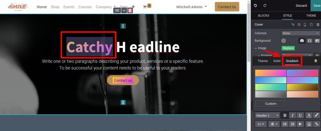 The text in the website can be improved. One of the new features I really like is the new gradient system. So you could select some text, click on the gradient here and that’s it. It would add up to the modern feeling of the website. You can also have a button with the same design. Button customising has plenty of new options. You can select a custom style, fill color which includes the gradient in custom shades as per your wish by fine tuning it through a gradient configurator, borders, shapes, size and more.