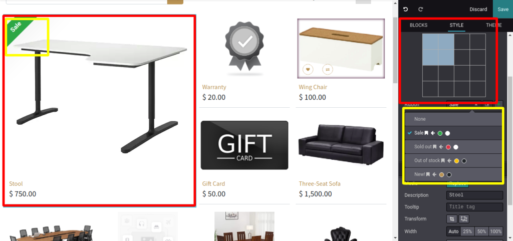 Suppose a product is generating massive percent of the revenue so it’s an important product. You can highlight it on the screen. Just click on it and add a ribbon to it on the top left or right corner. Now the ribbon is absolutely customisable with the size and shape. You can also make the product appear bigger by selecting the squares you want the product to cover.