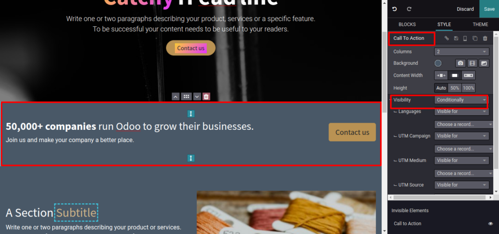 You can also add call to action and customise it visibility based on the preference. The visibility feature in odoo 15 is for user targeted content. You can have it for returning visitors, based on the country, on phone number, coming via some specific link etc. You can create dynamic content that adapts to your visitors.