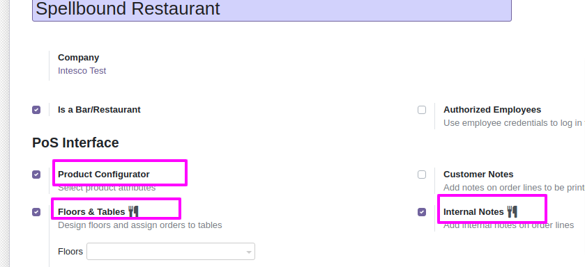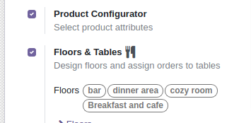 - Here I have ticked PRODUCT CONFIGURATOR to select product attributes, FLOOR & TABLES to design the floor plan which we will discuss later in this blog and INTERNAL NOTES to add internal notes to the order line, pretty self-explanatory itself.